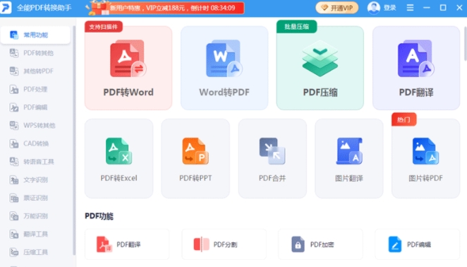 软件采用模块化界面设计,主要功能区划分为文档转换、工具应用、个人设置三大板块。首页直观展示PDF转其他格式、其他格式转PDF两大核心模块,每个功能入口均配有详细说明图示。文档处理区集成二十余种实用工具,通过标签分类实现快速定位。