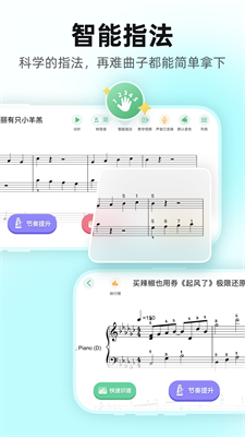 1、智能乐谱处理:具备动态谱面调节功能,支持升降调、变速播放、分声部练习等操作,适配不同演奏场景需求。
