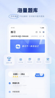 2、全真模拟考场:完整还原考试流程与评分标准,支持申论智能批改与行测即时评分,帮助考生提前适应考场节奏。