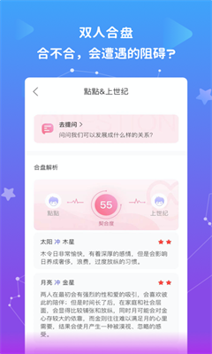 3、独创双人合盘评分系统,通过12维度数据分析生成缘分指数,详细展示情感契合度与潜在发展空间。
