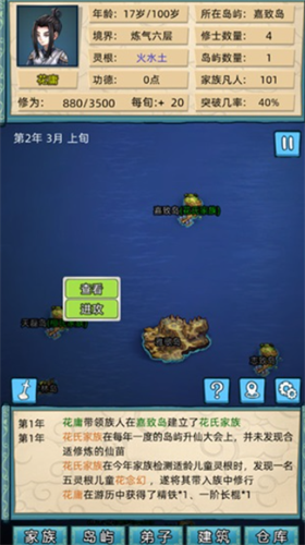 修仙家族修真经营免费模拟器以独特的文字叙事构建修真世界,玩家将执掌一个修真世家的发展命脉。开局仅需带领两名族人,从占领初始灵岛开启征程。周边星罗棋布的岛屿暗藏机遇与挑战,需谨慎评估各岛实力制定战略。随着家族底蕴的积累,可逐步解锁炼丹炼器、灵兽培育等修真百艺体系。