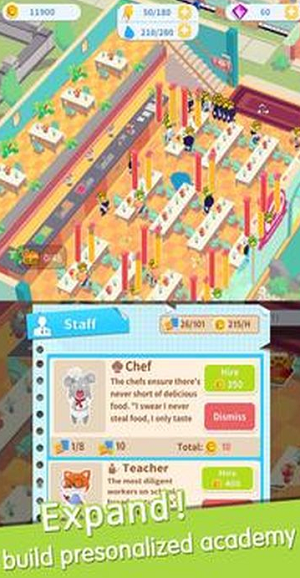 教职工团队建设系统别具匠心,招募不同性格的教师将影响教学风格。严厉的河马教授能快速提升学员成绩,而活泼的兔子老师则擅长激发创造力,合理搭配教师阵容是制胜关键。