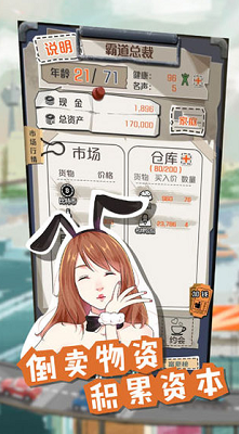 1亿小目标内置功能菜单是一款充满策略性的模拟经营手游。玩家通过敏锐的市场洞察力进行商品交易,在虚拟世界中体验从白手起家到资产过亿的商业传奇。游戏创新性地将资本运作与生活元素相结合,在仓库管理、公司运营之外,还能感受婚恋社交、子女培养等多元化玩法。