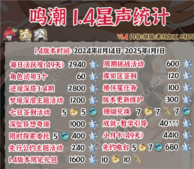 鸣潮1.4版本能获取多少抽卡资源?作为一款以二次元画风为核心的动作冒险手游,《鸣潮》凭借精致的场景设计与多样化的角色养成体系,持续吸引着玩家探索未知领域。随着1.4版本更新计划正式公开,本次将重点解析版本周期内各类星声资源的获取途径与总量,助玩家精准规划角色抽取方案。