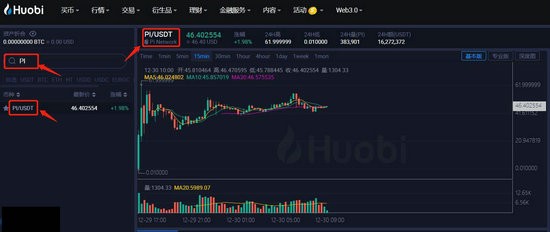 3、在币种检索栏输入项目代码PI,从系统匹配的流动性池中选择PI/USDT标准化交易组合,该交易对采用Tether稳定币作为计价单位。