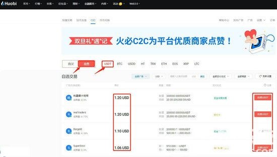 6、在商户列表筛选界面勾选「出售」选项,指定结算币种为USDT,通过对比商户信用评级、成交量和报价信息,选定符合需求的交易对手方。