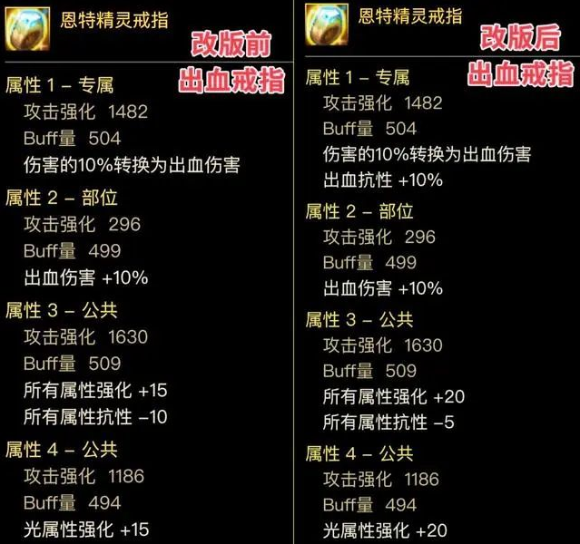 出血系戒指建议配置10%出血增幅与转伤强化,搭配全属性和单属性强化词条;中毒流派则需10%中毒增幅配合15%中毒伤害提升,同步叠加转伤与全属强属性。