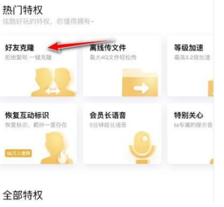 3、在会员特权目录中查找"社交关系管理"分类,其中包含好友克隆、好友恢复等实用工具。需特别注意该功能仅对有效期内超级会员开放,普通会员及非会员无法使用此项服务。