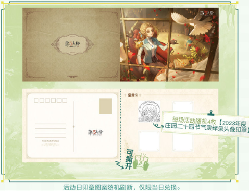 官方同步开启线上互动环节,4月20日至21日活动期间,玩家在微博超话、小红书、抖音平台发布带#第五人格24节气#话题的现场图文/视频内容,或在哔哩哔哩使用#第五人格二十四节气演绎录#话题参与创作,均有概率获得官方账号翻牌,被选中者将额外获赠限定周边礼盒。