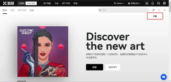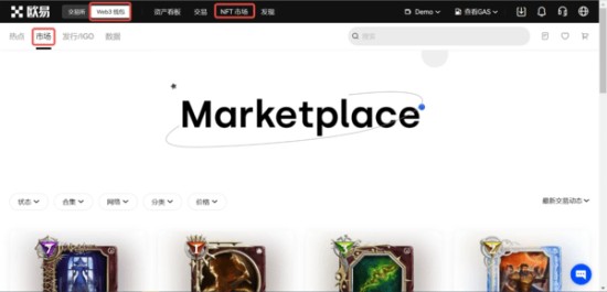1、访问欧意交易所官网,通过首页顶部导航栏依次选择【Web3 钱包】—【NFT市场】—【市场】入口。平台提供智能搜索与多维度筛选工具,用户可根据创作者、系列名称或价格区间快速定位目标NFT资产。