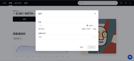 (1)竞价拍卖机制:当页面显示【出价】选项时,用户可发起个性化报价。点击功能按钮后需完成钱包授权验证,随后输入期望的购买数量、单价及订单有效期。系统将自动冻结对应金额的数字资产作为保证金。