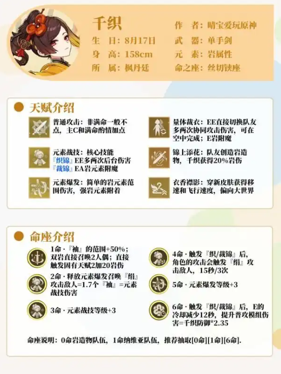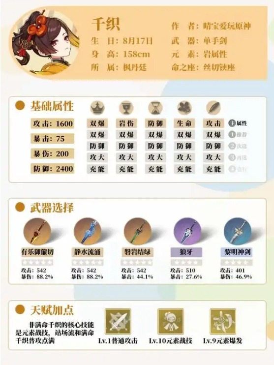 千织武器圣遗物如何选择?队伍如何配置?作为4.5版本登场的岩系单手剑角色,千织凭借独特的技能机制成为当前版本热门选择。本文将从实战角度解析其装备配置与阵容搭配策略,为不同阶段的玩家提供深度指导。