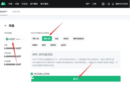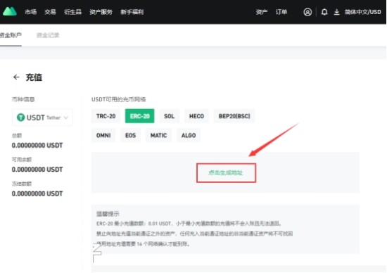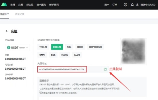2、进入资产管理界面后,定位"数字货币充值"功能按钮。选择需要充值的具体币种时,需特别注意区块链网络协议的选择,该选项必须与转出平台的提币网络保持完全一致。以USDT为例,若从其他平台提取的是ERC20标准的代币,则此处务必选用ERC20网络对应的充值地址。