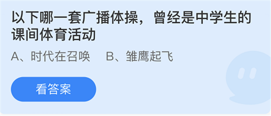 次题涉及校园体育文化:要求辨识「曾作为全国中学生课间操的广播体操体系」。正确答案指向教育部2002年推行的《时代在召唤》。这套体操融合了传统健身动作与现代韵律节奏,其推行文件明确指出适用对象涵盖普通中学、职业院校及中等专业学校,成为千禧年后重要的校园集体活动记忆。
