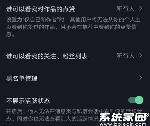 第五步:在隐私设置菜单中滑动至互动设置区域,找到带有眼睛图标的"不展示活跃状态"选项。该功能开关采用醒目的蓝色作为启用标识,右侧状态指示器直观显示当前设置状态。