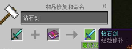 2、进入铁砧操作界面后,按照特定顺序放置物品:左侧输入栏放入待修复装备,中间栏放置经验修补附魔书。此时界面右侧会显示附魔后的装备预览,确认无误后需支付相应等级经验值完成操作。注意不同材质装备所需经验值会有差异,钻石装备通常需要更多经验消耗。