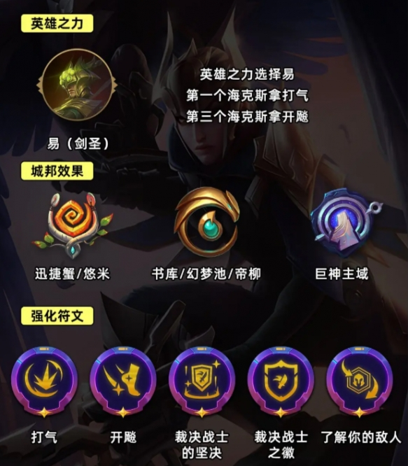推荐选用剑圣英雄之力,其专属强化符文打气可显著提升攻速收益,配合开飚的移速加成能实现快速走位集火。注意在3-2阶段优先选取群体增益型海克斯强化。