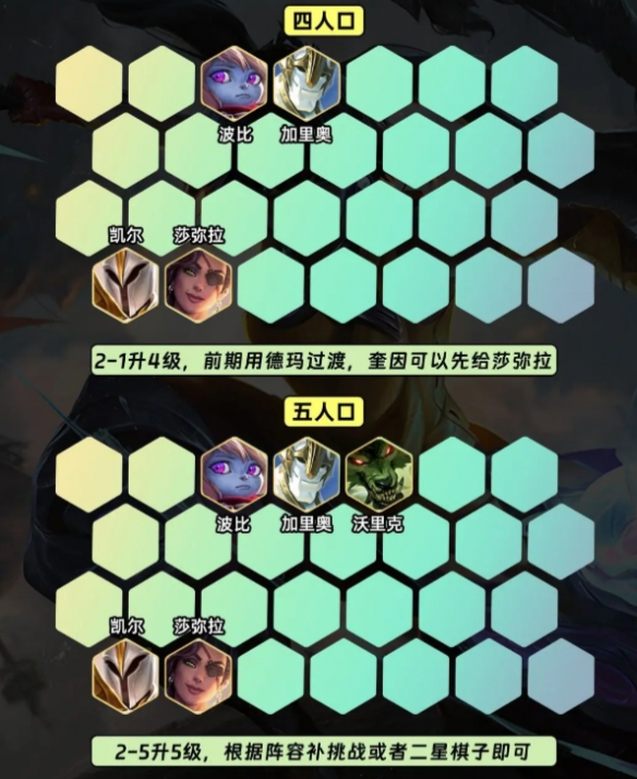 前期布局(2-1至2-5):开局抢暴风大剑或拳套,2-1阶段升至4人口,优先激活3德玛西亚羁绊,奎因装备可暂由后排物理系英雄携带过渡。
