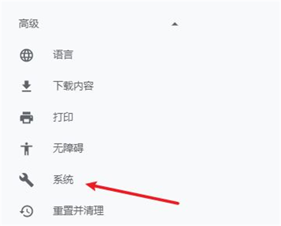 4、在展开的二级菜单中定位「系统」分类,此处集中管理浏览器基础运行配置。建议操作时关闭其他正在运行的应用程序,确保设置过程稳定。