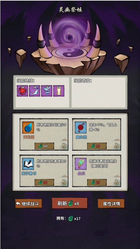 9.九幽塔推进讲究射程压制,优先选择箭、火等远程技能。开局利用六技能机制卡BUG,建议保留铜钱技能作为填充。血量控制在100点可激活护手特效,其余属性点全部投入攻击强化。