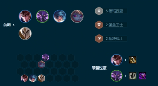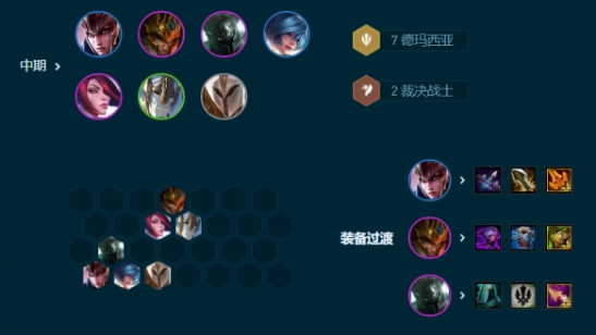 云顶之弈S9.5七德玛转职体系如何运营?本套战术以奎因为核心输出单位,配合高费卡装备联动形成爆发体系,德玛西亚羁绊提供的强化装备机制使其在前期即具备强势压制能力,下文将详解阵容构建与战术部署要点。