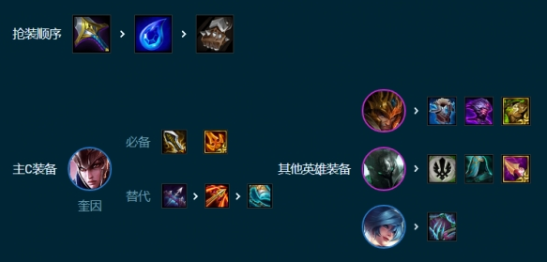 核心输出:奎因必备无尽之刃,光明杀人剑与轻语/飓风形成组合,建议追三星提升终结能力