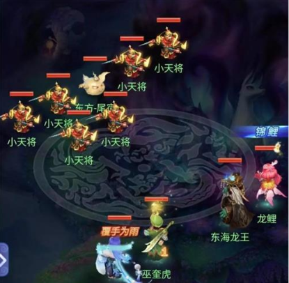 推荐布雨神君+红龙+龙鲤+巫奎虎组合。布雨神君水系法术与红龙火系攻击形成元素反应,龙鲤的群体增益可提升全队暴击率,巫奎虎作为主坦需优先提升防御属性。注意及时驱散敌方增益状态。